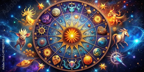 A stylized illustration of the twelve zodiac signs, set against a starry night sky, with colorful symbols and