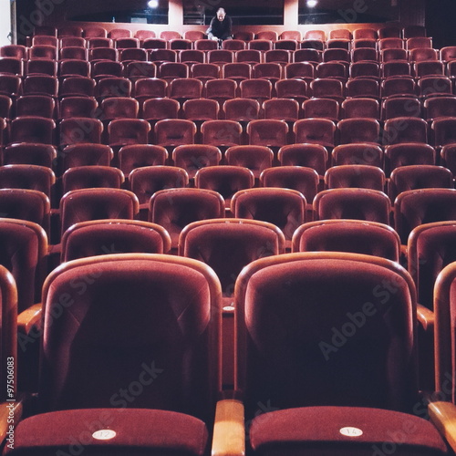 #964986293Empty seats in a theater, Empty Red Velvet Theatre Seats in Auditorium with Warm Lighting