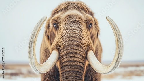 A close-up of a woolly mammoth showcasing its large tusks and fur in a snowy environment.
