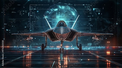 Powerful military jet is awaiting orders on the tarmac of a high tech hangar, ready to be deployed for its next mission