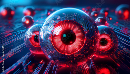電子回路で作られた赤く光る眼球。スパイウェアやプライバシーの侵害のイメージ。電子回路のような背景。