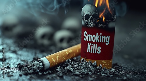 Burning cigarette pack with "Smoking Kills" warning and skulls in dark, smoky setting