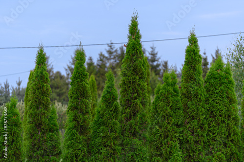 Piękne żywotniki zachodnie, cyprysy, wiecznie zielone drzewka ogrodowej, iglaki na żywopłoty