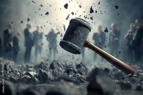 A visual of an auctioneer hammer coming down on a bankrupt company’s assets, with bidders in the background, symbolizing liquidation and asset selling