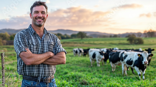 éleveur de vaches posant fièrement dans son champ devant son troupeau
