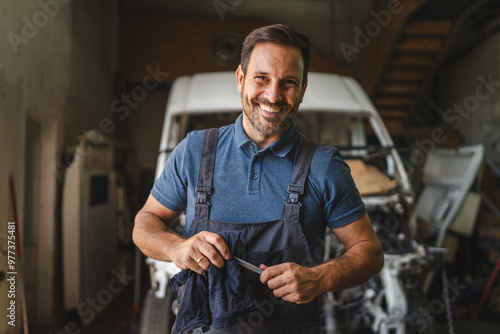 Car mechanic in workshop with unfinished car maintenance work