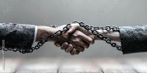 Scales tipping between a handshake and broken chains, symbolizing negotiation for freedom or compromise