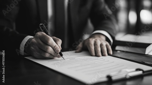 A businessman signing a document with a pen, showcasing professionalism and attention to detail in a classic black and white setting.