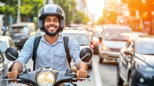 A young man enjoys riding his motorcycle through busy city traffic in the late afternoon, wearing a helmet and a backpack, radiating positivity amidst the hustle