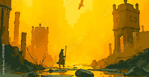 A yellow fantasy scene, Character with staff finds ruins of a holy site, Pixel art
