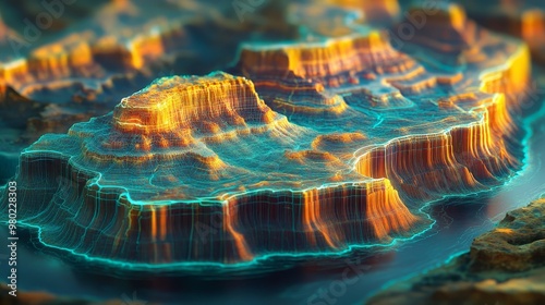 A futuristic aerial scan of the Grand Canyon, holographic overlays highlighting geological layers, the Colorado River rendered in glowing digital lines, Sci-fi, 3D, Hologram