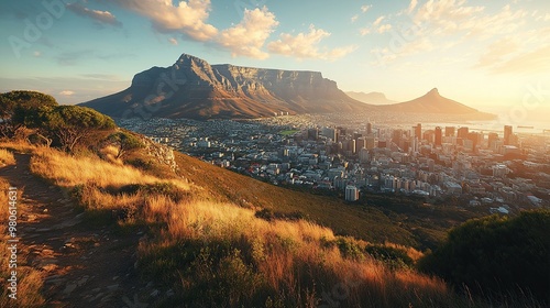 Scenic view of Table Mountain overlooking a vibrant city during sunset.