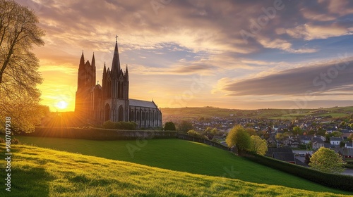 Majestic view of Downpatrick's Cathedral Church, Northern Ireland, with its grand Gothic architecture and serene surroundings.