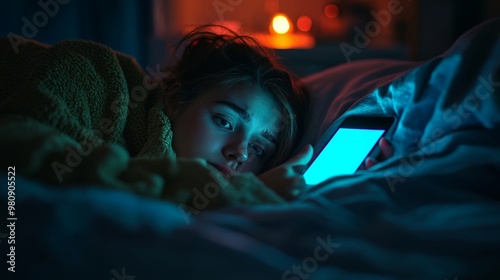 A person lying awake in bed, staring at a bright phone screen, unable to sleep due to blue light and digital distractions.