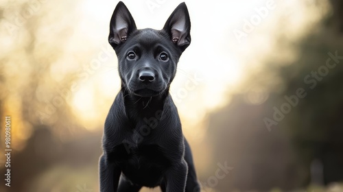 Alert Black Belgian Malinois Puppy Standing Guard with Intense Gaze in Natural Lighting