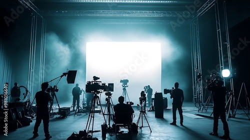 A film set with cameras and crew preparing for a shoot in a dimly lit studio.