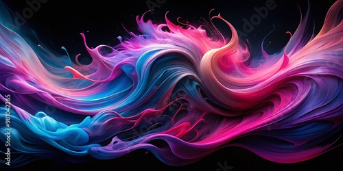 Vibrant, swirling patterns of pink, purple, and blue paint dance across a black background, evoking dynamic movement