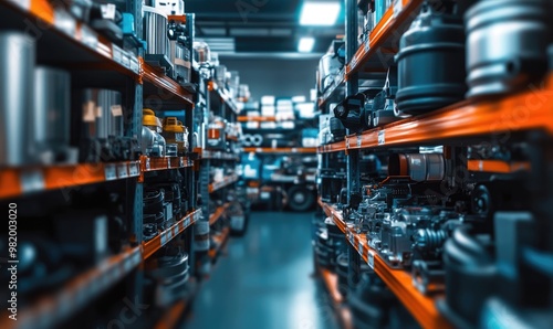 Blurred Shelves with Car Parts and Hardware in Auto Store Background