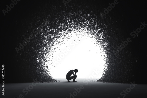Person in the light surrounded by dark depressing thoughts, Visual Representation of Mental Health Struggles,