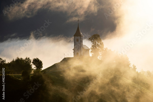 Jamnik, Slovenia - Magical foggy golden summer sunrise at Jamnik St.Primoz church.