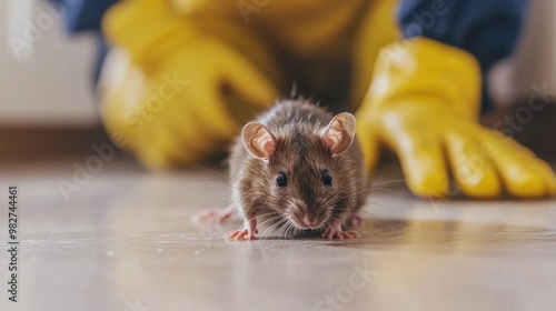 Close-up shot of a rat on the floor with a pest control worker in yellow gloves blurred in the background, ready to act.