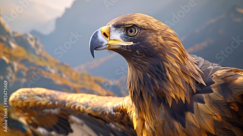 golden eagle in mid-flight, captured against dramatic backdrop of a mountain range, sunlight glints off its feathers, emphasizing bird's strength and freedom as it navigates the skies.