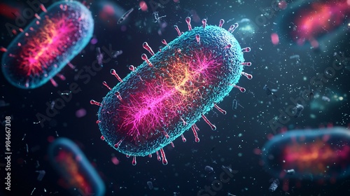 Diagram of bacterial binary fission, highlighting cell division process. Dark backdrop with bright colors.