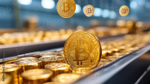 A scene of gold being refined while digital currency symbols float above the refinery, gold refining, digital currency, refinery