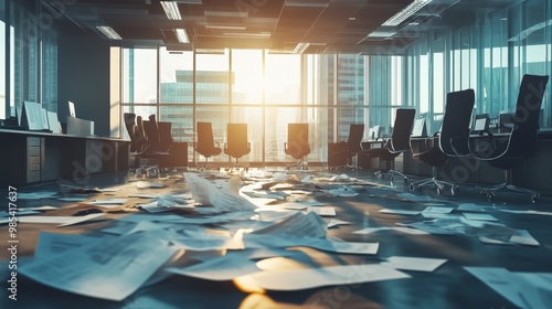 Empty office with chairs toppled and papers scattered, Failure, corporate liquidation