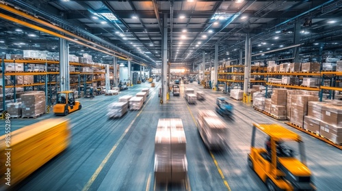 This bustling industrial distribution center showcases large shipping bays filled with activity, featuring neatly organized freight areas and busy forklifts transporting packages
