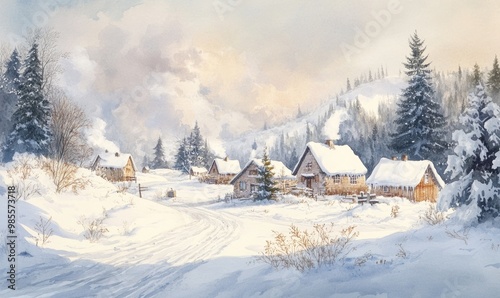 A painting of a snowy landscape with a road leading to a village