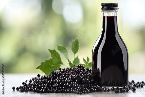 Organic elderberry syrup in glass bottle with fresh berries