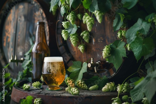 A glass of beer sitting on top of a barrel