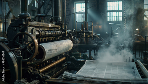 A steam-powered printing press producing a daily newspaper