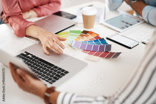 Teamwork, color swatch and hands of business people in office for planning, interior designer or meeting. Moodboard, creative palette and project management with closeup and laptop for style layout