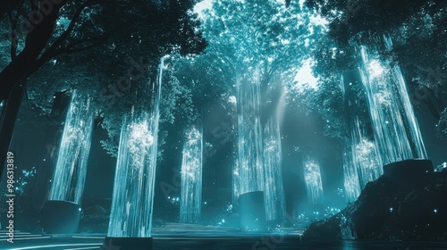 Floating 3D trees made of translucent glass, softly glowing in a futuristic forest.