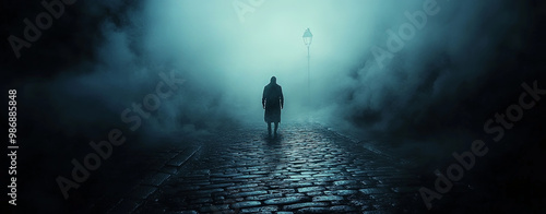 mysterious figure walks down foggy cobblestone street, illuminated by distant streetlamp. atmosphere is eerie and haunting, evoking sense of suspense and intrigue