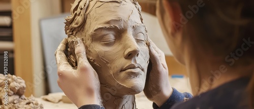 A sculptor carefully molds a clay bust, focusing on the intricate details of the face, embodying artistry and craftsmanship.