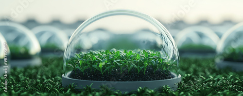 miniature greenhouse with young plants under glass dome symbolizes sustainable growth and low carbon footprint choices. This image reflects importance of nurturing nature