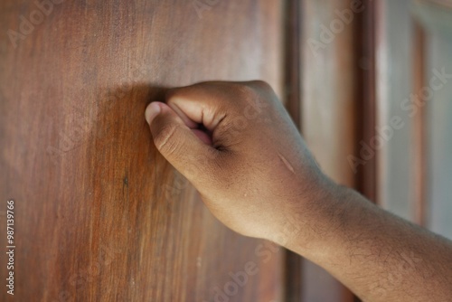 Male hand is knocking on wooden door, conceptual image. Visitor or guest is at the door.