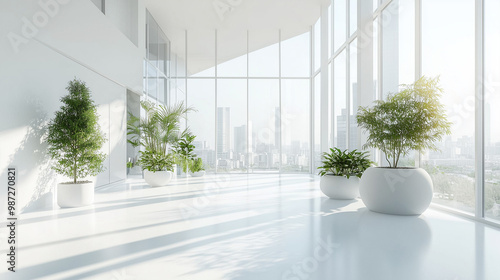 Wnętrze o minimalistycznym charakterze, gdzie białe ściany kontrastują z zielenią roślin. Światło słoneczne swobodnie wpada przez panoramiczne okna.