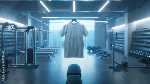 Sportswear T-shirt mockup displayed in a futuristic gym where the shirt's fabric adapts to the wearer's body, creating a perfect fit that moves with ease