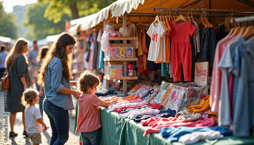 Flea market stall with gently used children’s clothing, promoting sustainable shopping.