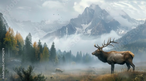 Majestic Elk Stands Amidst Misty Mountain Landscape with Vibrant Autumn Foliage
