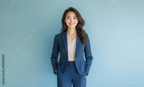 Ambitious and assertive Asian businesswoman in a blue suit, displaying a focused and determined expression. She projects confidence and authority, ready to take on leadership roles.
