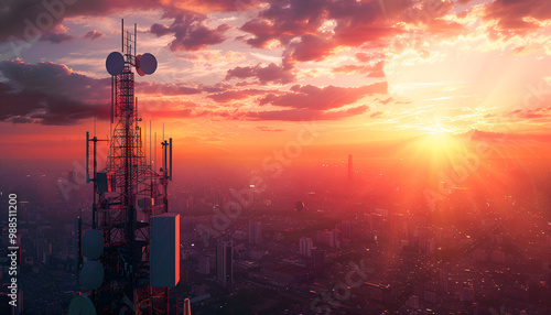 A 3d base station receiver on a telecommunication tower against a vibrant sunset over a cityscape, symbolizing connectivity and communication