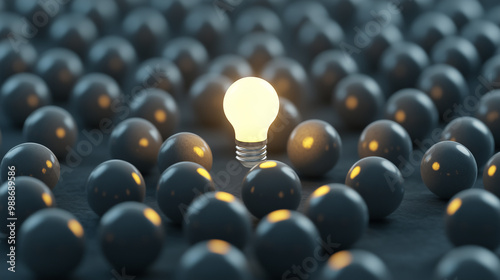 One glowing light bulb standing out from the crowd of many others on a dark background