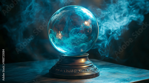 Kryształowa kula na ciemnym tle z unoszącym się dymem, symbolizująca magię wróżenia.