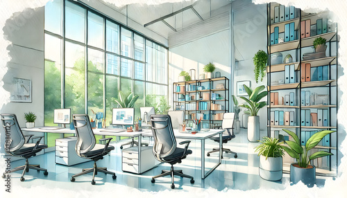 水彩風のモダンオフィスと自然光