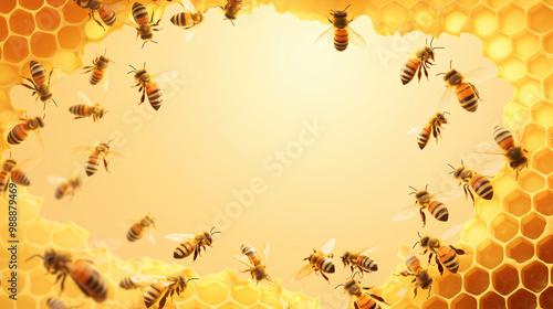 Pracowite pszczoły latające wokół sześciokątnych komórek plastra, pełnych złotego miodu.